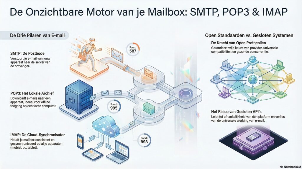 In de structuur van e-mail vervullen drie fundamentele componenten verschillende functies: SMTP, POP3 en IMAP. Elk van hen verklaart deels waarom e-mail technologische veranderingen, platformoorlogen en de evolutie van apparaten heeft overleefd. Bovendien is het begrijpen van deze standaarden in een wereld die gedomineerd wordt door API’s en gesloten systemen een belangrijke strategie om interoperabiliteit te behouden en technologische blokkades te vermijden.
